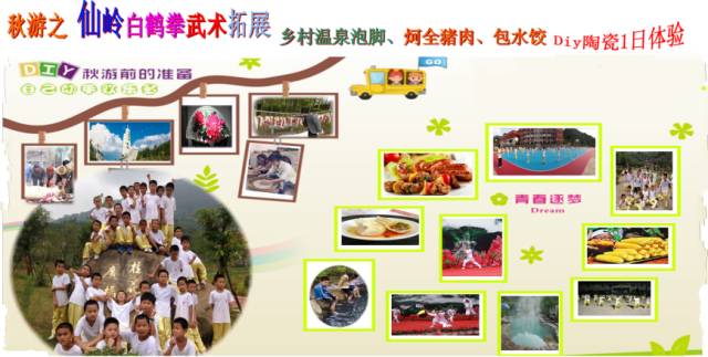 07:30 | | 09:30 | 抵达德化德化顺美生活馆,第一步:走进彩瓷的童话世界,有资深的展馆讲解员为我们介绍顺美陶瓷文化(15分钟左右) 第二步:以某个器物为主题(陶偶上色),让孩子们自由发挥,DIY出自己心目中的作品。期间有问题可以请教专业师傅(1小时) 学习陶笛——是一种具有悠久历史的吹管乐器。现代陶笛的雏型曾在不同文化中出现。在中国有一种近似陶笛的古老乐器:埙。至于中国的“埙”跟陶笛有没有共同源头,已无从稽考,而两者除了外形上的分别外,主要的分别还在于陶笛有哨口,埙则没有;共通点则是两者都是主要以陶泥烧制的闭管式乐器。而在南美的玛雅人和阿兹特克人亦于六世纪出现一种用于装饰和祭祀的仿鸟鸣的彩绘乐器,也被认为可能是现代陶笛的雏型。 | 12:00 | 前往有着泉州后花园美誉的魅力山城永春,永春是远近闻名的武术之乡,目前有武术村3个,武术教育与学生武术拓展基地1个,位于蓬壶镇仙岭村的武术教育基地是学生春秋游拓展的首选之地。 | 12:30 | 品尝美味的午餐(炣农家猪肉、自己动手包水饺、大鼎饭等风味美食) | 13:30 | 抵达辉龙武术协会,武术协会成立于2012年,协会以团结武术爱好者及关心支持武术事业发展的 社会各界人士,广泛开展推动武术活动的普及,努力提高武术运动技术水平,促进我县武术对外交流与合作,为构建和谐社会,增强人民体质,促进社会主义精神文 明建设而奋斗为宗旨,致力于团结全县各界武术人士,组织和发动武术爱好者对永春白鹤拳及流传在民间各种形式的武术项目进行挖掘、整理和研究,积极开展武术 交流活动,与省内外、台港澳及国外武术组织及武术工作者、武术爱好者友好往来,传播、交流武术技艺,传承永春白鹤拳文化,推动我县武术运动的普及与提高。 | 13:40 | 武术拓展:学习武德条文——武术演练——学打白鹤拳——学生交流——学员桂花文化广场表演。进行分组,家长退后,和学生分开,老师必须在场维持秩序。 拳谚有云:“未曾学艺先学礼,未曾习武先明德。”在漫长的岁月里,中国古代武术不仅逐渐形成了一整套自己独特的理论、技术、功法,也形成了一套与武术密切相关的道德体系,也就是人们常说的武德。中国武术千门万派,但所有的门派都将培养武德作为习武者的首要要求。 白鹤拳是发祥于永春县的一种独特拳种,是中国武坛上的一朵奇葩。它始创于清康熙年间,在传说中,一位美丽的姑娘——方七娘,从翩翩起舞的白鹤身上受到启发,创造出一套优美的拳路。白鹤拳后来向外广泛传播到八闽及台湾、东南亚等地,名师辈出,享誉海内外。白鹤拳既不像虎拳那样阳刚毕露,也不像蛇拳那般阴柔诡异,而是讲究刚柔并济。俗谚有云:“永春白鹤拳,无烧也拉沦(闽南语微温意)。”即形容永春白鹤拳的威力。 与其他武术门派一样,永春白鹤拳也有自己的武德标准,即“五戒”、“五顾”及“懔十戒”的规条。其五戒是:“戒淫欲,戒酒兴,戒欺侮老人,戒欺侮小儿,戒欺侮妇女。”其五顾是:“一须顾己体,二须爱学弟,三须和乡邻,四须知高低,五须敬师长。”懔十戒是:“戒好斗,戒好胜,戒好名,戒好利,戒骄,戒诈,戒浮夸逞能,戒弄虚作假,戒挑拨离间,戒为非作歹。”永春白鹤拳拳谱中还有习拳时要注意“善修其身,善正其心,善慎其行,善守其德”的要求。 | 15:00 | 前往以热水命名的汤头城,享受乡村温泉泡脚(车程15分钟)。之前泡过不少温泉,说真的真正是温泉水的没有,都是人工加热和加了自来水的.这家承诺无论是冷水和热水都是百分百纯天然的.说他们的冷水都是温泉抽起来放冷的.试过就知老板是不是吹的了.于是我们就选择了泡一个池,最喜欢的就是来了才放水的,放上满满一池水.不怕是人家泡过的。 | 16:30 | |